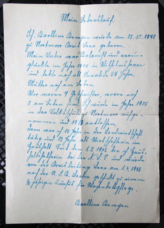 Mein Lebenslauf. Ich, Karlline Kempen wurde am 15.10.1898 zu Nortmoor Kreis Leer geboren. Mein Vater war Kolonist und verunglückte im Jahr 1905 in Wilhelmshaven und lebte noch als Invalide 27 Jahre. Mutter noch am Leben. Wir waren 9 Geschwister, wovon noch 5 am Leben sind. Ich wurde im Jahre 1905 in der Volksschule zu Nortmoor aufgenommen und 1912 entlassen. Dann war ich 15 Jahre in der Landwirtschaft tätig und 12 Jahre als Wirtschafterin im Haushalt. Seit dem 1.3.1942 bin ich Haushaltslehrerin bei der N.S.V. und wurde von der Kreisleitung Leer am 1.4.1943 nach der U.F.R. Berlin geschickt zu einem 1/2 jährigen Kursus für Wochenbettpflege. Karlline Kempen |